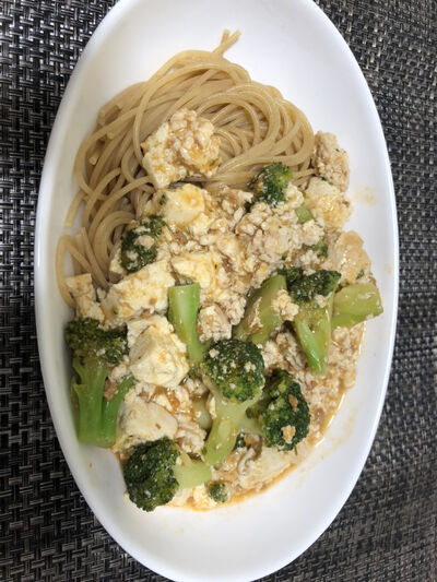 パスタに麻婆豆腐をかけて、食卓に並べたら完成。