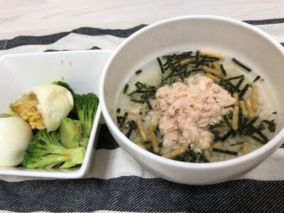 お茶漬けは美味しいけど栄養素が全然足りない為、ツナとブロッコリーとゆで卵で補う。